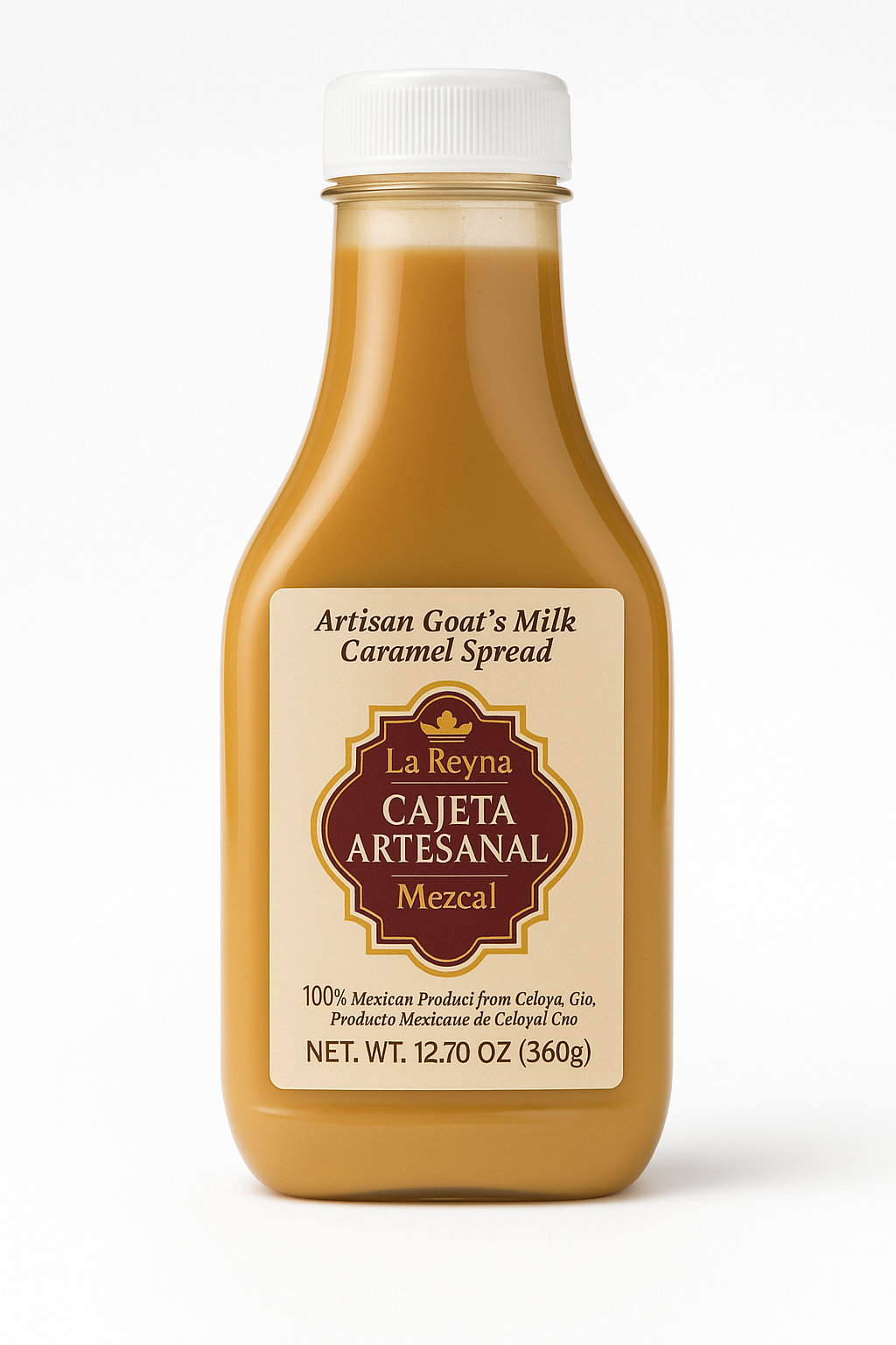 100% Artisan Goat's Milk Cajeta Artesanal - Mezcal Infused 12.7 oz (360g). La Reyna Cajeta Artesanal, it's an artisan goat's milk caramel spread, which prominently features a rich, golden-brown caramel color inside the jar. A 100% Mexican product from Celaya, Guanajuato. The soft, natural taste enhances a delightful treat for those who enjoy gourmet spreads.