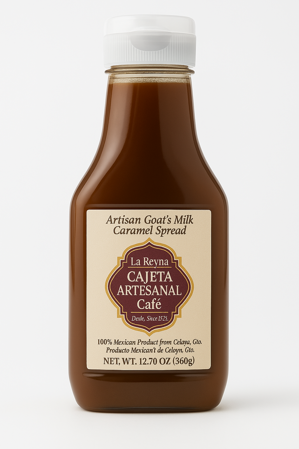 100% Artisan Goat's Milk Cajeta Artesanal La Reyna - Cafe/ Coffee Infused 12.7 oz (360g). La Reyna Cajeta Artesanal, it's an artisan goat's milk caramel spread, which prominently features a rich, golden-brown caramel color inside the jar. A 100% Mexican product from Celaya, Guanajuato. The soft, natural taste enhances a delightful treat for those who enjoy gourmet spreads.